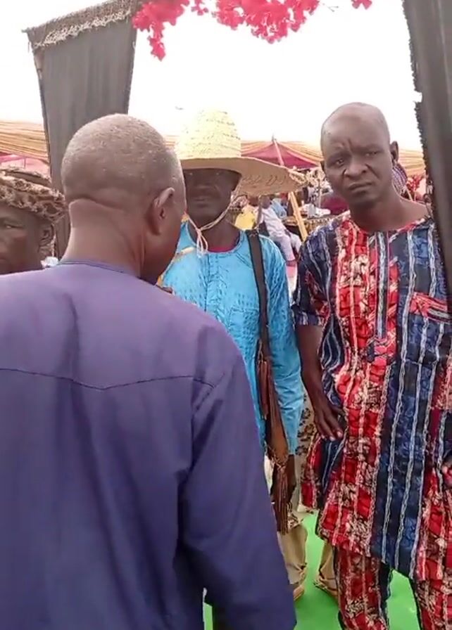 The video features a group of four men standing outdoors, seemingly at an event or gathering. The man on the right is wearing a colorful, patterned outfit, while the man in the center is dressed in a light blue robe and a wide-brimmed straw hat, holding a wooden staff. To the left of them, another man is in a blue long-sleeved shirt. A fourth man, farthest to the left, is wearing a tan outfit with stripes. Overhead, a decorated archway with red flowers is visible. The background shows tents and more people. The overall impression is of a cultural event or celebration.