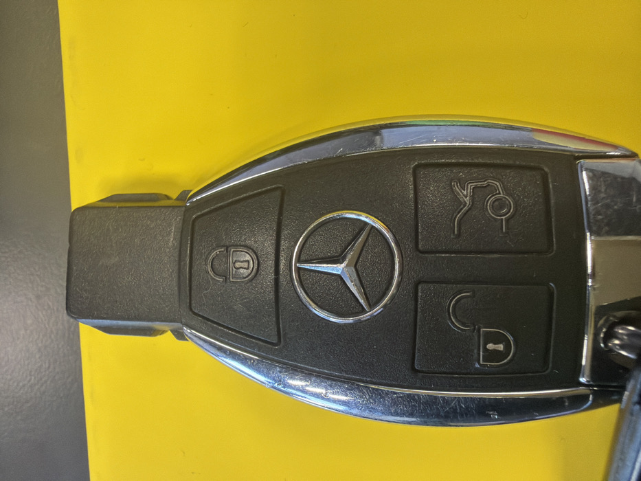 A Mercedes-Benz car key fob is depicted in a close-up, top-down view