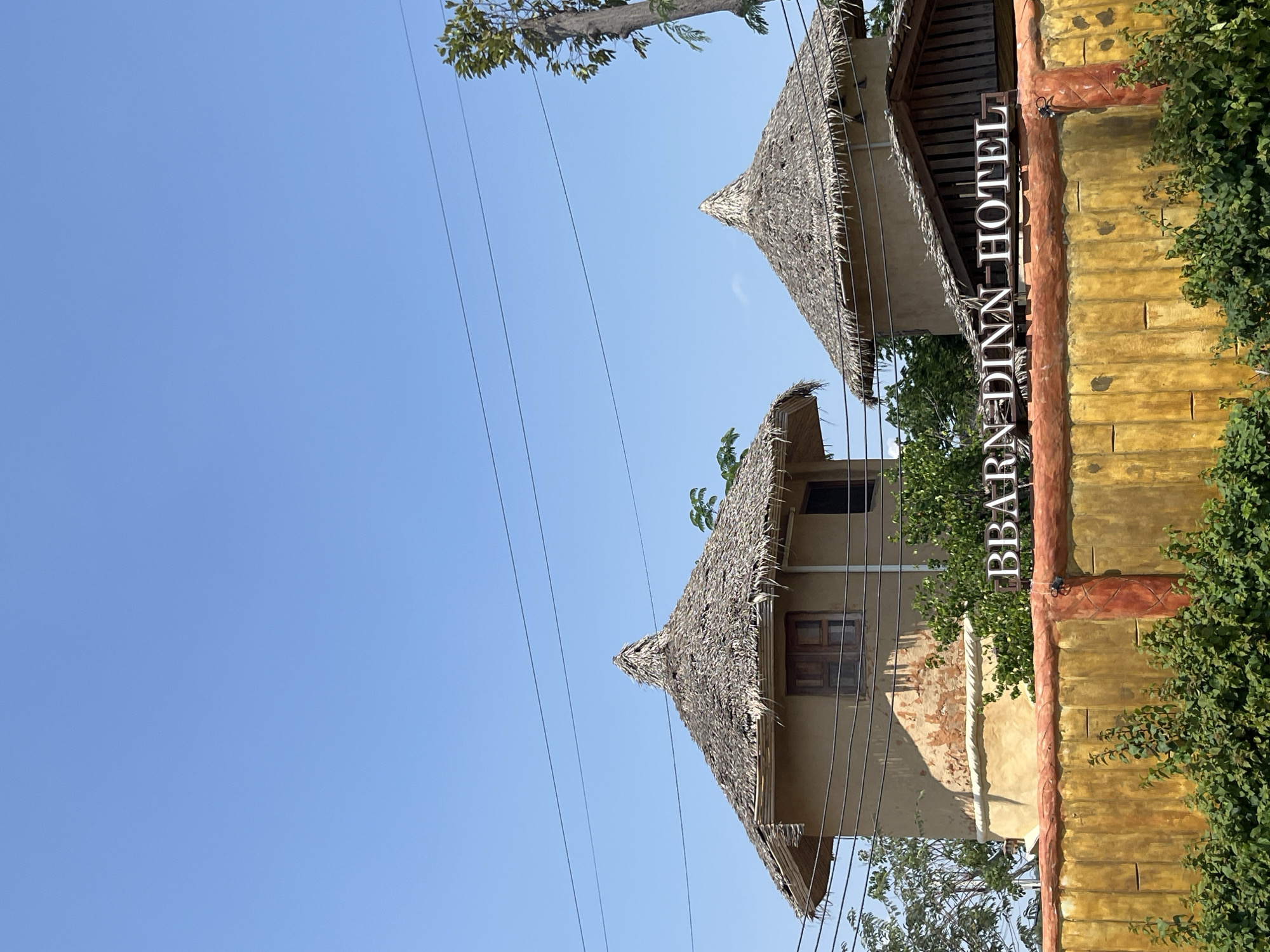 two buildings with thatched roofs, presumably part of the "Bbarn Dinn-Hotel" establishment in Muang Pattaya, Thailand. The buildings are tan or beige in color, and a sign bearing the hotel's name is attached to a wall covered in green vegetation. Power lines are visible against a clear blue sky in the background. The shot is taken from a low angle, looking upward. The overall impression is of a tropical or resort-style lodging.