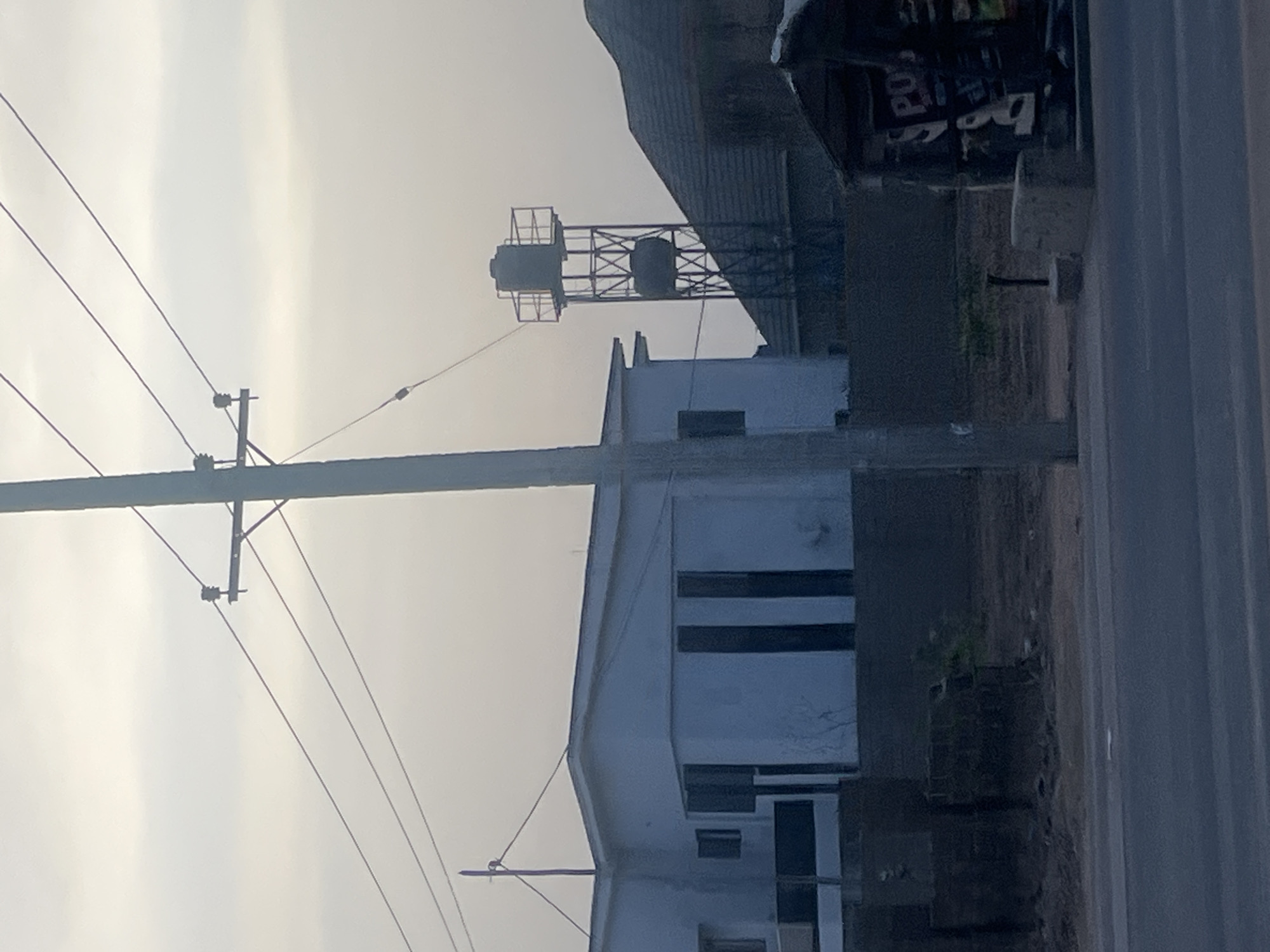 The image presents a scene from Rido, Nigeria, featuring a utility pole with attached electrical wires against a backdrop of buildings and an overcast sky. A two-story white building with a series of dark horizontal bands or panels on its facade is visible. In the background, a water tower with two cylindrical tanks is mounted on a metal lattice structure. A partially obscured building with visible lettering is located to the right. The foreground consists of a blurred, light-colored vertical structure, obscuring details of the street level.