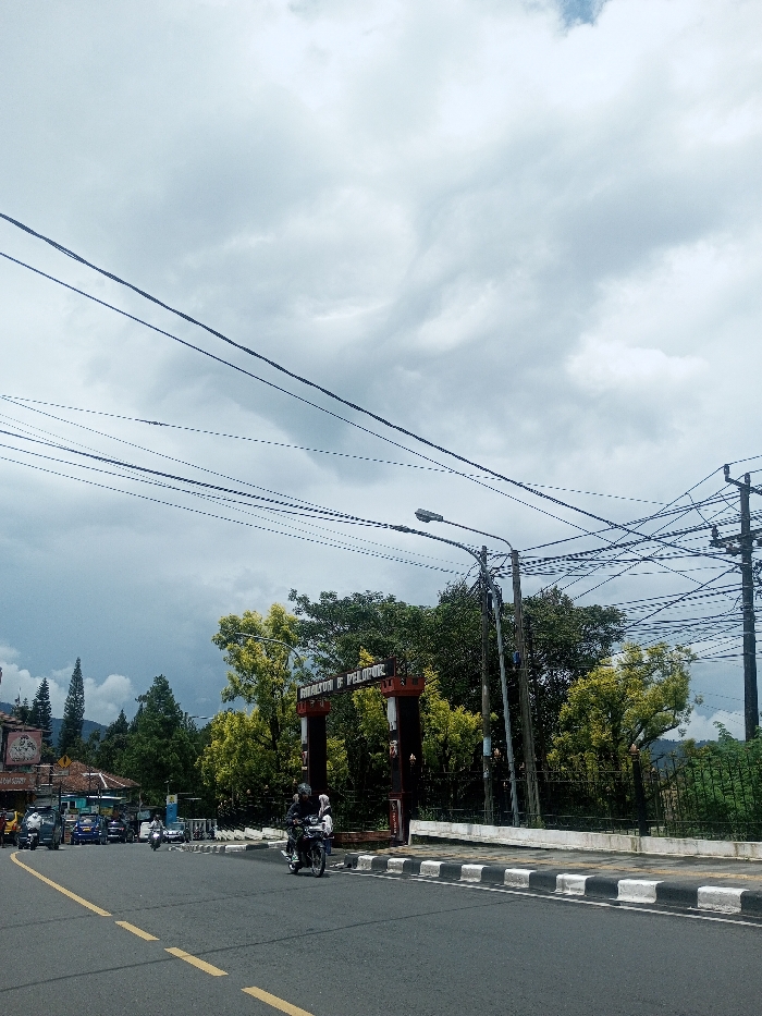 A street scene under a cloudy sky features an arched gate with the words "Gerbang Pelopor." A motorcycle passes through the gate. Utility lines crisscross the sky above. Various cars and other motorcycles are visible in the background. Trees and shrubs line the area beyond the gate. A black-and-white curb separates the road from the landscape. A street lamp stands near the gate.