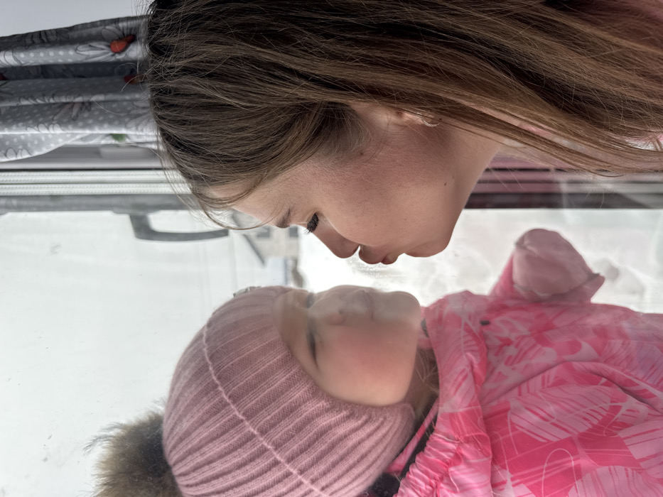 The image captures an adult female and a young child interacting through a clear window in Gornyi (Dvurechenskoe S/P), Russia