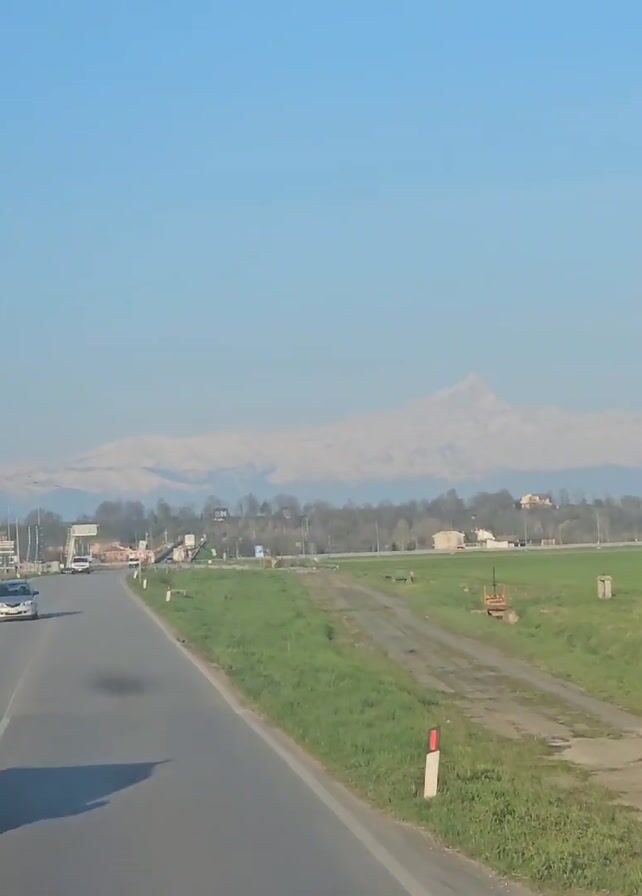 road with a white van driving on it. To the side of the road is a green field. In the distance, there are snow-covered mountains under a clear blue sky. There are also some buildings in the distance. The camera appears to be inside a moving vehicle.