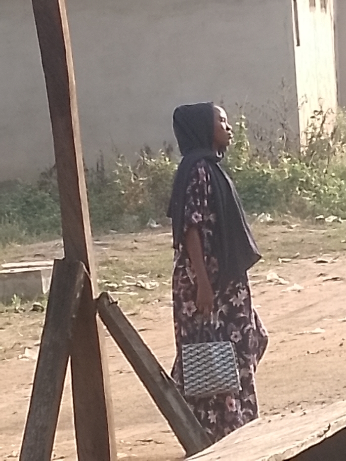 A woman in a dark floral dress and a black headscarf is walking outdoors, holding a small patterned purse