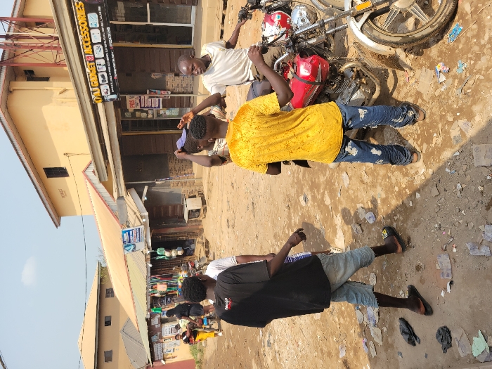 An outdoor scene in a commercial area of Awka, Nigeria, is captured under daylight. The ground is unpaved, uneven, and covered with dirt and scattered debris, including paper, plastic, and discarded items. In the mid-foreground, a group of approximately four young males are gathered. One male, wearing a yellow, short-sleeved, patterned t-shirt and distressed blue jeans, stands with his back mostly to the camera, positioned next to a red motorcycle. Another male, wearing a white t-shirt, is seated on the red motorcycle, facing left. A third male, dressed in a light-colored t-shirt, stands between these two, with his hands near his head. To their left, a fourth male, in a black t-shirt and light blue denim shorts, walks towards the left of the frame, wearing dark flip-flops. In the background, multiple buildings line the street. On the right, a two-story light-yellow building features a prominent sign for "KAJ GADGET & ACCESSORIES" on its ground floor, also indicating "POS AVAILABLE HERE." To its left, several single-story structures with reddish-brown corrugated metal roofs house various small shops, with merchandise visibly hanging outside. Further left, other individuals are observed walking along the path near these shops. A partial view of a white motorcycle is visible in the bottom right corner. The sky is clear, indicating fair weather conditions.
