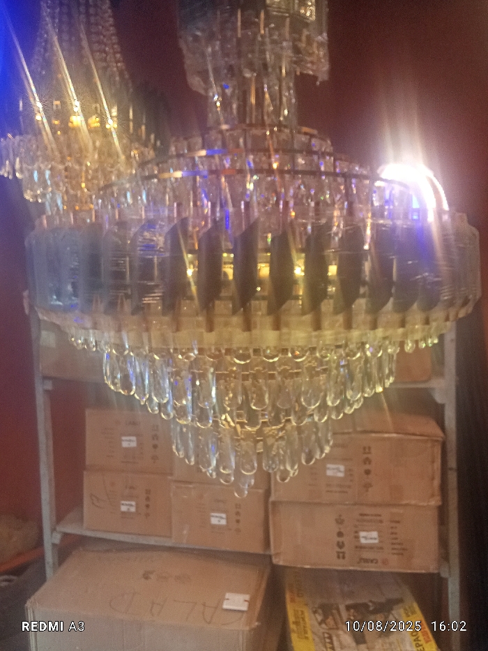 This image depicts a large, illuminated crystal or glass chandelier suspended indoors within what appears to be a retail or storage space in Obosi, Nigeria