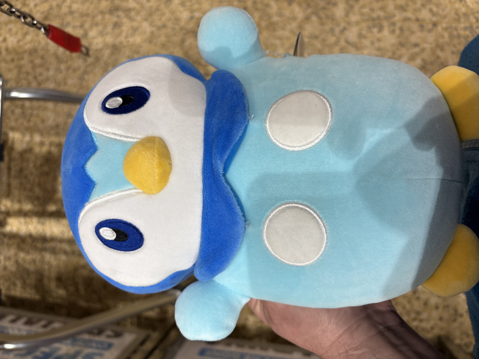 An adult human left hand holds a blue and light blue plush toy, identified as Piplup from the Pokémon franchise, centrally in the frame