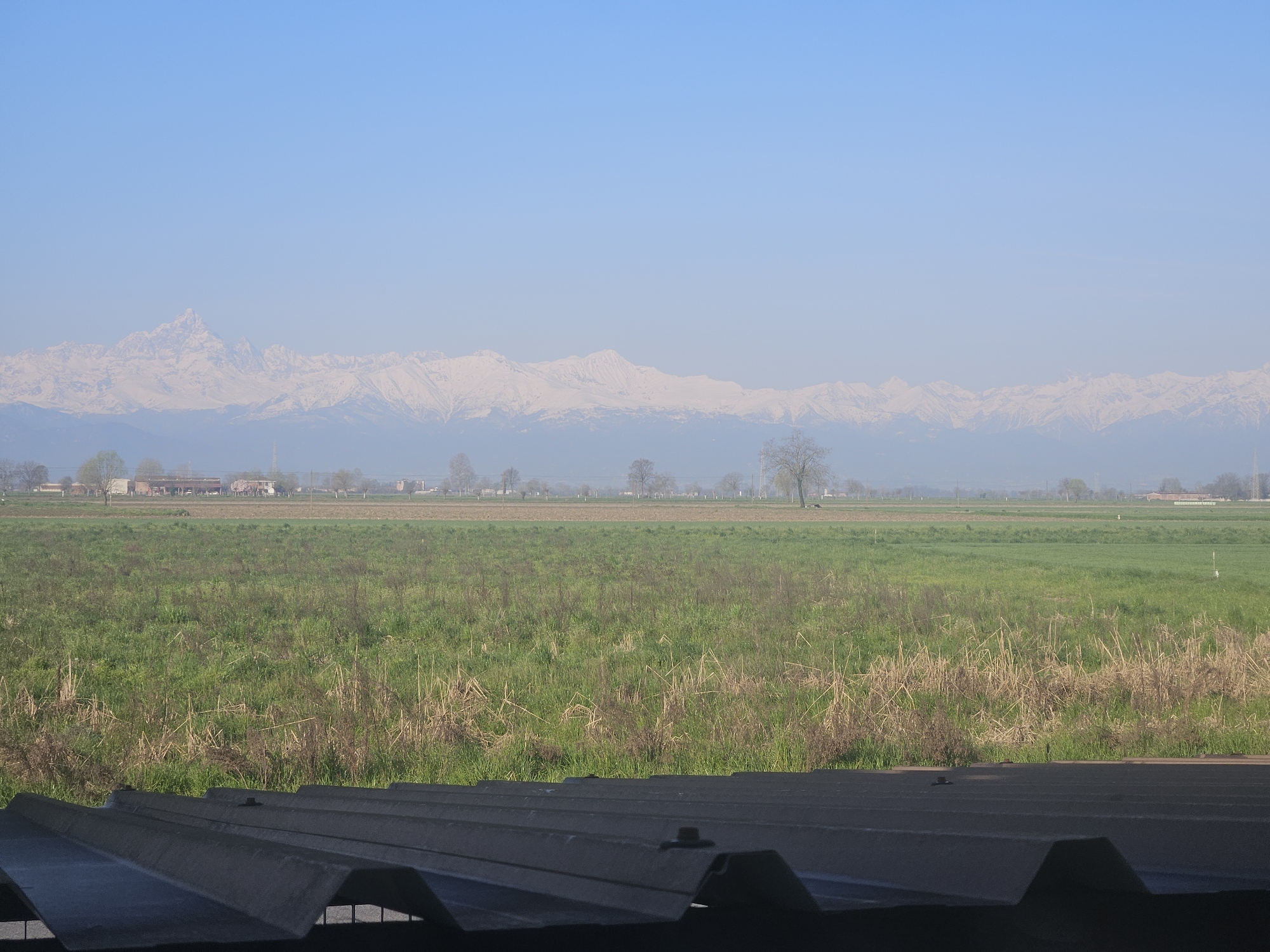 The image depicts a vast, clear-day agricultural landscape in Racconigi, Italy, with a prominent mountain range in the background