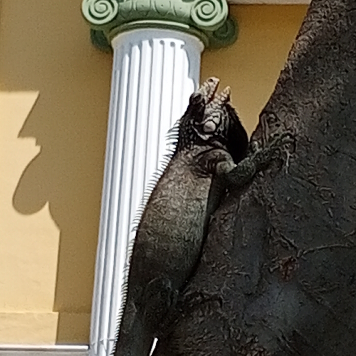 A gray iguana is perched on a dark, textured surface, possibly a statue or tree, with its head raised and mouth slightly open. The iguana has spiky scales along its back and prominent claws on its front legs. In the background, a white, fluted column with a green capital is visible against a light yellow wall. A shadowed shape appears on the wall beside the column.