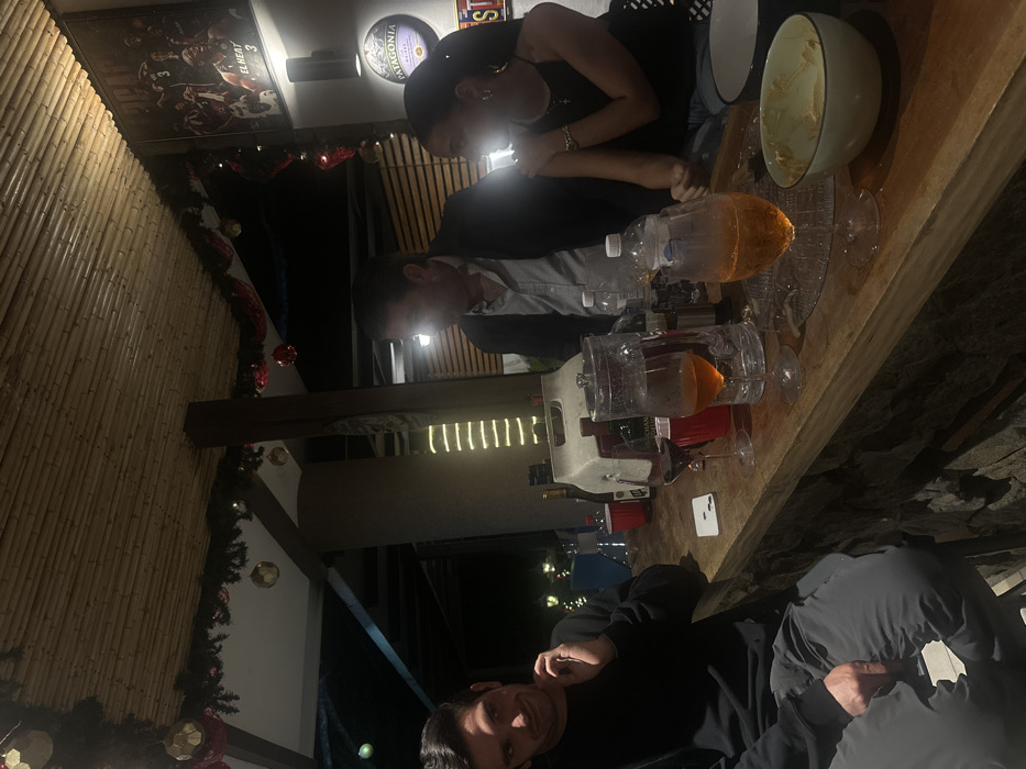 A social gathering is in progress at an outdoor venue decorated with Christmas garlands. A woman and a man are standing around a wooden table laden with pitchers of orange liquid and various beverages. An empty bowl sits nearby. Another man lies relaxed with a blanket on the lower portion of the frame looking at the camera. A framed basketball poster hangs on a wall in the background.