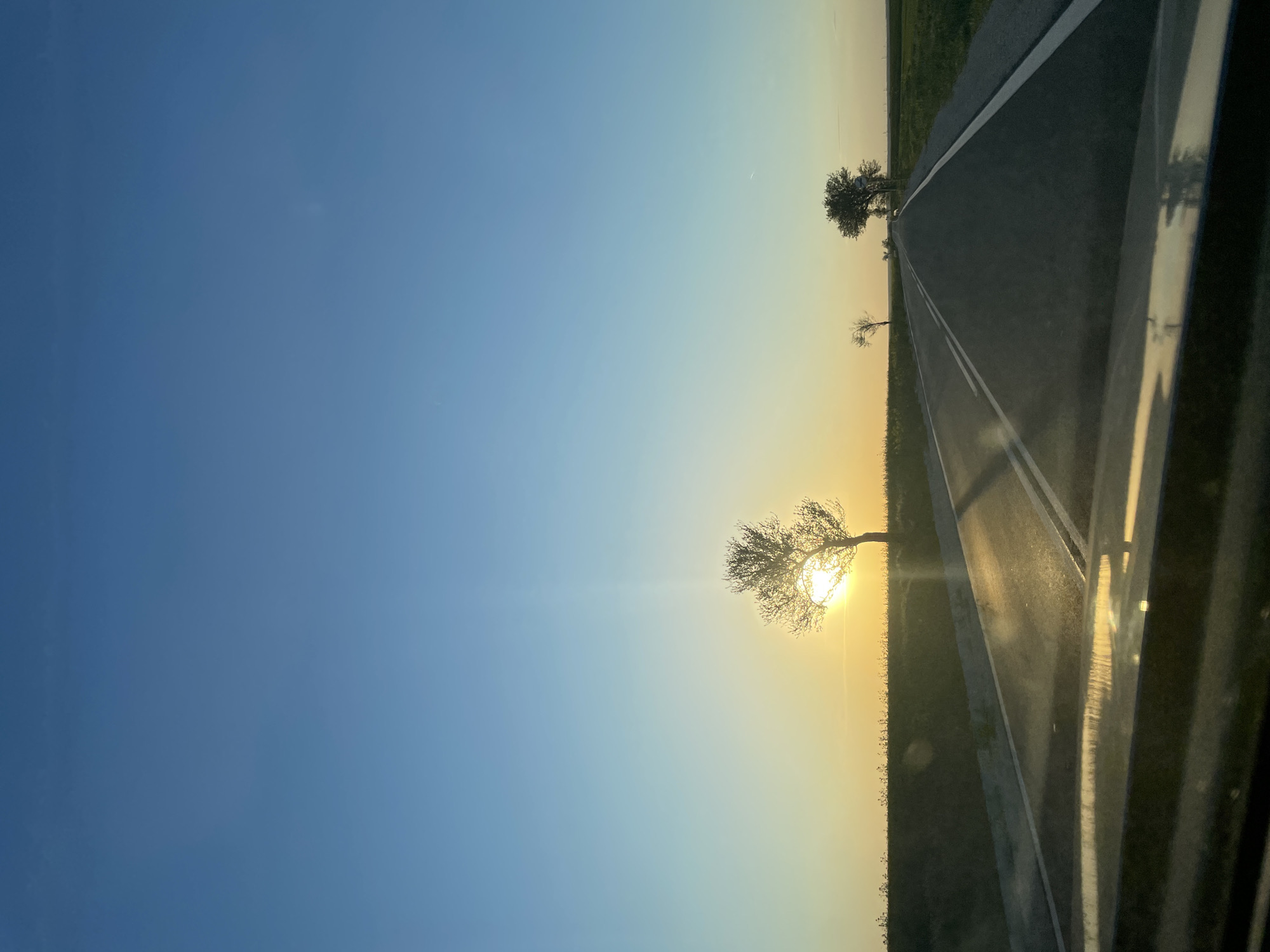 road in Kamenar, Bulgaria at sunset. The sun is partially obscured by a tree on the roadside, creating a glare. The road has a dividing white line, and the view is slightly obstructed by a car window frame. The sky transitions from blue to yellow near the horizon. Other trees are sparsely situated further along the road. The environment appears rural with open fields.