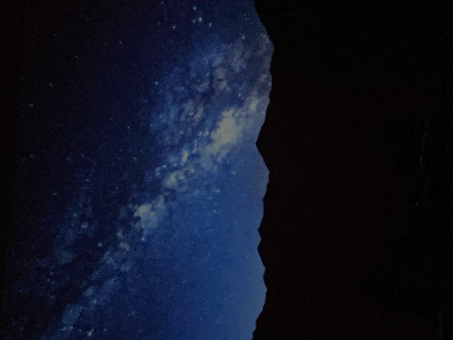A blue and dark-toned image displays a celestial view next to a solid black area. The blue section resembles a night sky filled with stars and clouds, with brighter areas indicating dense star clusters. The dark black area occupies the right side of the image, creating a stark contrast. The boundary between the two sections is uneven, giving the impression of a natural border between the cosmic scene and an undefined void.