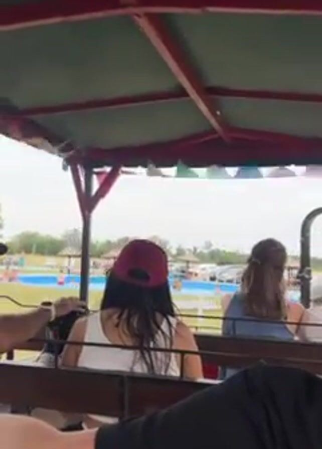 group of people riding in a trolley pulled by a tractor through an outdoor park. The trolley has a red frame and green roof decorated with colorful flags. The riders sit on wooden benches. The view from the trolley reveals a swimming pool area with people swimming and sunbathing, palm trees, and other park amenities. The sky is overcast. The camera focuses on the people riding in the trolley, showing their backs and sides as they look out at the scenery. The tractor driver wears a black hat and white shirt and is seen operating the vehicle. The ride appears to be slow and leisurely, allowing the passengers to take in the sights of the park.