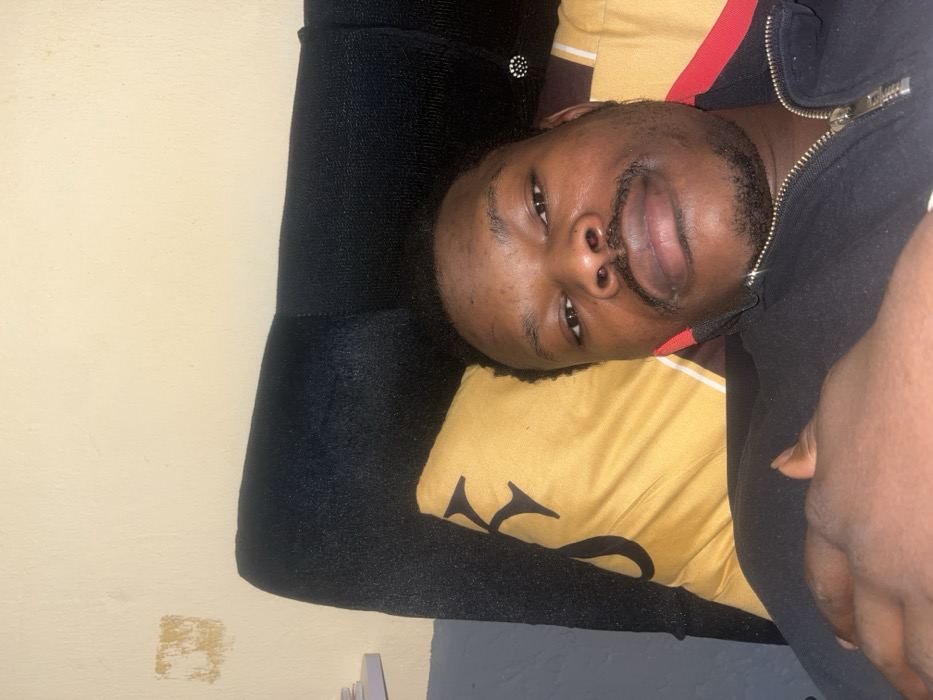 A dark-skinned man reclines on a black textured couch, head resting on a yellow pillow with a black design. He wears a black hoodie with a zipper slightly open, revealing a red accent on a lighter-colored shirt. The background features a light-colored wall with a small damaged area. The image is presented in a rotated orientation.