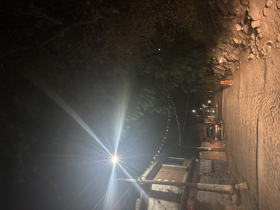 A nighttime shot features a brightly lit street with stone buildings and trees. A powerful light source shines intensely, creating a starburst effect. A string of lights hangs above the buildings, adding a festive touch. A dirt or cobblestone road runs along the right side, and an orange cat sits near the edge. The overall scene conveys a rural setting illuminated by artificial light in the darkness.