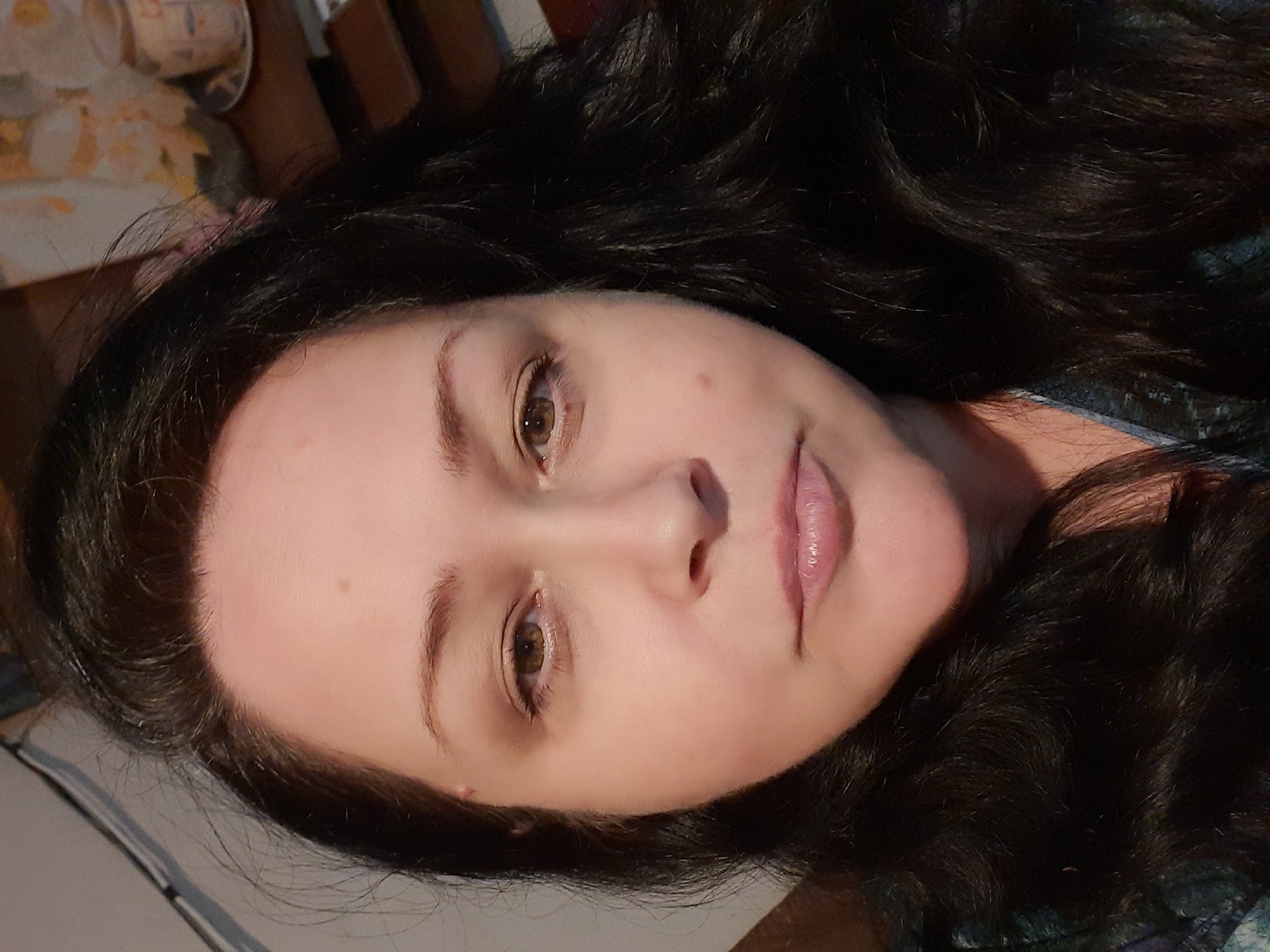 A close-up, tilted selfie of a Caucasian woman with dark brown, wavy hair
