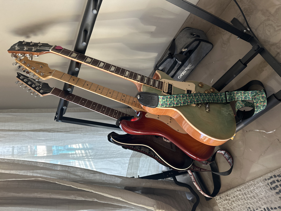 The scene is an indoor environment in the City of Mexico City, Mexico, featuring musical instruments. Four electric guitars are arranged on a black metal multi-guitar stand against a plain, light-colored wall. From left to right: A dark brown-bodied electric guitar, mostly visible from the back, with a white patterned strap hanging. Adjacent to it is a red burst-finished electric guitar with an Ibanez headstock and a dark fretboard. Next is a natural wood-finished electric guitar with a light fretboard and a Fender-style headstock. The rightmost guitar is a greenish-blue, Les Paul-style electric guitar with trapezoid fretboard inlays and a dark headstock. A multi-colored fabric strap, patterned with green, red, and white, is attached to this guitar and rests on the floor. A pink guitar pick is lodged in the strings near the headstock of this greenish-blue guitar. To the left, a light-colored, sheer curtain hangs, obscuring a window through which diffused sunlight is visible, creating faint shadow patterns on the fabric. The floor is composed of light-colored, polished tiles. A portion of a light-colored rug with a dark geometric design is visible in the lower-left corner. A grey soft-sided gig bag or case, bearing the "GHOSTFIRE" logo, rests on the floor to the right of the guitar stand. No individuals are present in the image.