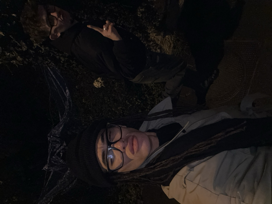 Two individuals are laying on the ground in a dark setting, possibly outdoors. The person in the foreground wears glasses, a black beanie, and has dreadlocks. They are wearing a light-colored jacket. Above them, a second person with glasses is partially visible, wearing a dark jacket. They are making a peace sign with their fingers. The background is obscured, but appears to be foliage and some scattered debris. The lighting is dim, making details difficult to discern.