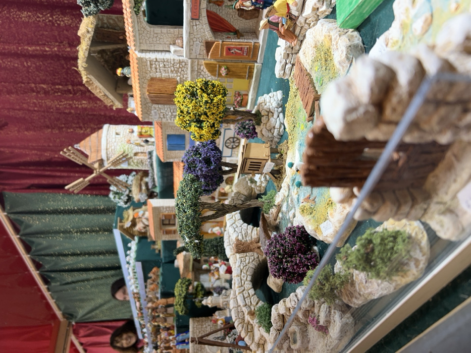 A miniature village scene includes stone buildings, a windmill, and colorful trees. Small figures populate the scene, and a small wooden bridge spans a body of water. The diorama is displayed under glass. Two people can be seen in the background, looking at the diorama. Red and green curtains are above the village, likely part of a display.
