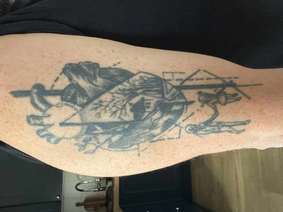 - "The image displays a black and grey tattoo on the upper arm of an individual, photographed indoors within a kitchen setting located in Chantepie, France" by FM-o3Fqy2, licensed under CC BY 4.0
