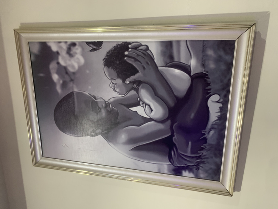 A framed grayscale image hangs on a white wall. The artwork depicts a shirtless man holding a young child. The child reaches out, hand near the man’s head. A butterfly hovers above them. The background appears to be nature, possibly a garden or forest. The frame is a light silver color with a double border. The image appears to be a drawing or illustration rather than a photograph.