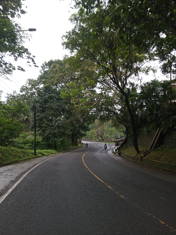 The image depicts a winding asphalt road in Vaatharawattai, Sri Lanka, under an overcast sky. The road surface appears wet, indicating recent precipitation. A broken yellow line marks the center of the road, and a solid white line defines its left edge. Lush green foliage, primarily tall trees, densely lines both sides of the road, forming a natural canopy in sections. On the far left, a grassy incline ascends into dense vegetation. On the right, a concrete retaining wall with a visible drainage channel runs parallel to the road, supporting higher, tree-covered ground. Further down the road on the right, a small, dark-colored structure or stall is partially visible. Beyond the trees on the upper right, part of a light-colored building with dark windows is discernible. In the distance, two motorcycles are observed traveling away from the viewer along the curved road. A streetlight fixture is positioned on the upper left, extending over the road, with utility lines visible beneath the overcast sky.