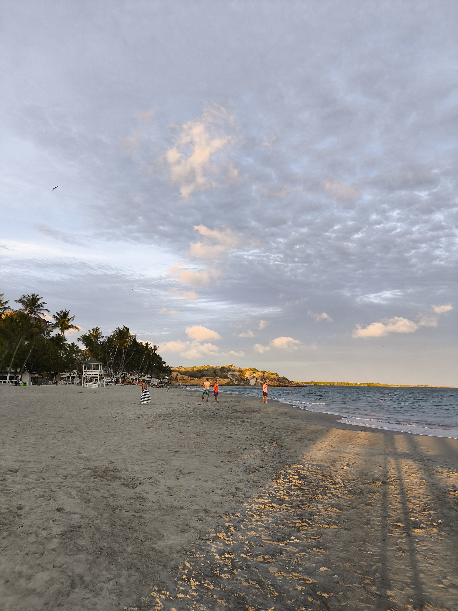 The image depicts El Yaque beach in Venezuela at dusk. The beach is sandy with palm trees along the shore. Several people are present, including individuals walking along the beach and some swimming in the water. There is a lifeguard stand visible. The sky is cloudy with a few pink tinted clouds. A bird flies in the sky. Tree shadows are cast on the sand near the water.