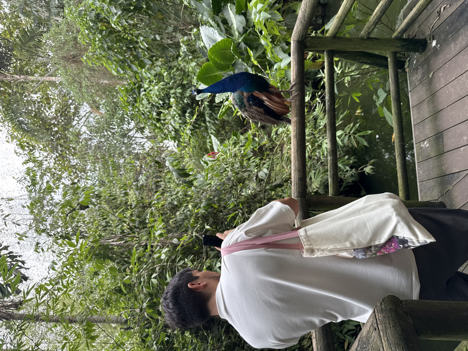 A male individual, seen from behind, is standing on a wooden deck in a lush, tropical environment. He wears a white short-sleeved polo shirt and dark trousers, with a light-colored tote bag featuring pink straps and a colorful pattern slung over his right shoulder. He holds a black smartphone horizontally with both hands, aiming it towards a peacock positioned on a wooden railing to his right. The male peacock exhibits an iridescent blue head and neck, with brown and green plumage on its body, and is facing left, away from the viewer. The railing consists of three horizontal wooden beams and vertical supports. Below the railing and the peacock is a calm body of water reflecting green foliage. The background is densely populated with various green trees and tropical plants. This scene is consistent with an animal park or botanical garden, specifically resembling the Bioparque Ukumari in Pereira, part of the Area Metropolitana Centro Occidente (AMCO), Colombia.