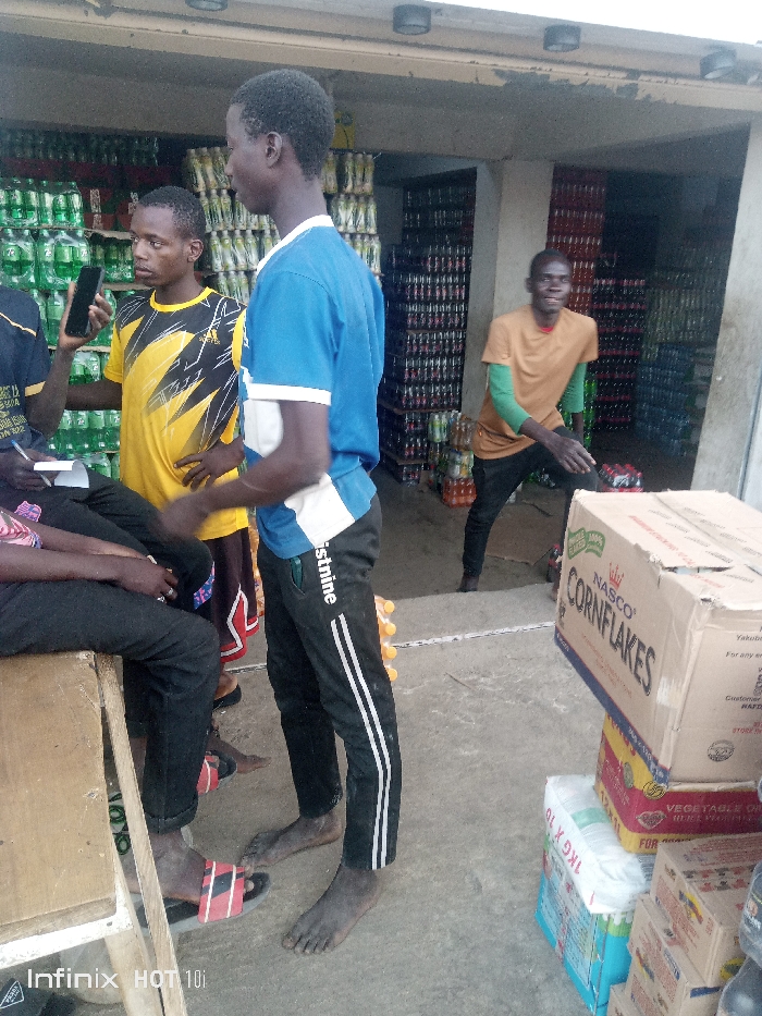 This image captures an indoor scene within a commercial establishment, likely a wholesale or retail beverage distributor, located in the city of Muhammadu Dikko Stadium, Nigeria. The area features numerous stacked crates and cases of bottled and canned beverages, predominantly soft drinks, against the back and side walls. In the foreground, a dark-skinned individual wearing dark pants and red and black slide sandals is seated on a light-colored wooden bench or stool, with only their lower torso and legs visible. They appear to be holding a small white notepad or paper and a pen. Adjacent to the seated individual, a dark-skinned male with short dark hair stands facing to the right, presenting his back to the viewer. He wears a blue t-shirt with white short sleeves and a white stripe across the abdomen, black track pants with two white vertical stripes on the outer leg, and the word "istnine" visible on his left thigh. He is barefoot. To the left of the central standing figure, a dark-skinned male with short dark hair stands facing towards the left. He wears a yellow t-shirt with a black and white abstract graphic pattern. He holds a black smartphone vertically in his right hand, which is positioned near his ear, while his left hand rests on his hip. In the background right, another dark-skinned male is partially visible, leaning forward with outstretched arms, as if in motion or reaching for an object. He wears a tan or orange short-sleeved t-shirt over a green long-sleeved undershirt and dark pants. He is also barefoot. The floor is a light-colored concrete. In the mid-ground right, a stack of cardboard boxes is visible. The top box is a "NASCO CORNFLAKES" box, prominently displaying green text and a "100% Whole Grain" logo. Below it, a box for "VEGETABLE OIL" and another partially visible box labeled "1KG X 10" are stacked. Two dark, circular light fixtures are mounted on the ceiling. A watermark "Infinix HOT 10i" is present in the bottom left corner.