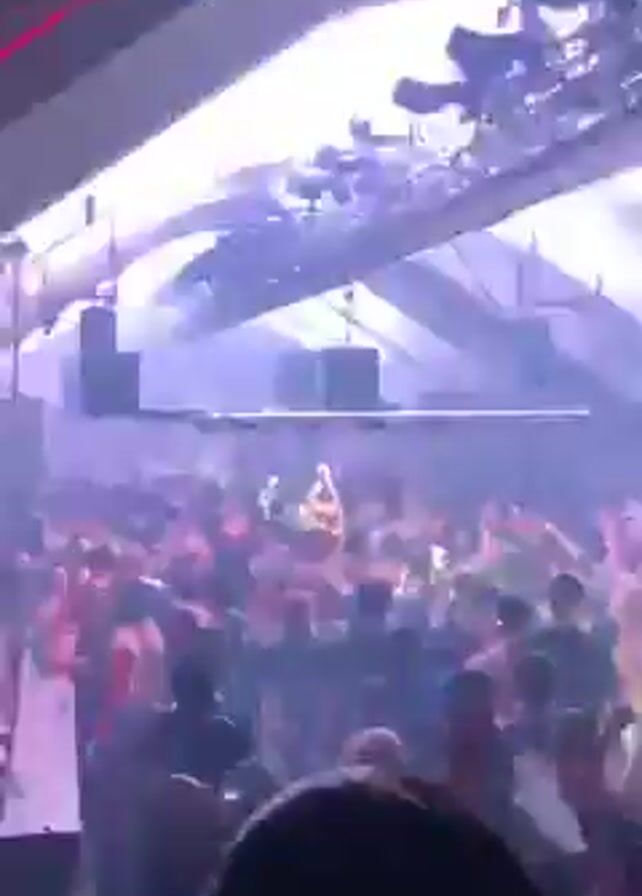 A crowd of people dances under flashing white lights in a large, dark, indoor space. There are multiple speakers and spotlights mounted on the ceiling. A red laser beam flashes above the crowd. The general atmosphere is energetic and festive.