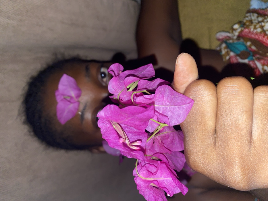 A close-up, eye-level photograph depicts an individual, likely a child or young person, partially obscured by a cluster of vibrant magenta bougainvillea flowers