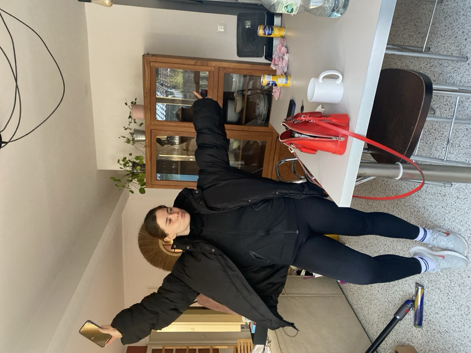 The image depicts a female individual striking a pose in what appears to be a residential interior, likely a kitchen or dining area connected to a living space. The specific location in Lille, France, cannot be determined from the visual information provided. The subject, a young adult female, stands centrally, facing slightly right with her body angled towards the viewer. She is wearing an oversized black puffer jacket over a black high-neck top and black leggings, paired with white socks featuring blue stripes and light-colored athletic shoes. Her arms are extended outwards and slightly upwards, with her left hand holding a gold-colored smartphone aloft. Her facial expression is a distinct pout. To the subject's right, a white rectangular table with a metal base is visible, accompanied by two dark wooden stools tucked underneath. On the table, a red handbag with an open zipper, a white ceramic mug, two yellow beverage cans (one upright, one on its side), crumpled pink paper or tissue, and a clear plastic water bottle with a green label are arranged. In the background, to the left, a segment of a light-colored sofa is visible, with a Dyson stick vacuum cleaner resting on the speckled floor nearby. Behind the sofa, a dark object is placed on a surface. In the center-background, a large round mirror with a textured, possibly woven, frame hangs on the light-colored wall. To the right, a wooden display cabinet with glass doors showcases various dishes and glassware. Several potted plants are positioned on top of this cabinet. Through the glass of the cabinet, an outdoor view showing green foliage and parts of a building can be discerned. Overhead, a black multi-strand light fixture is attached to the white ceiling.