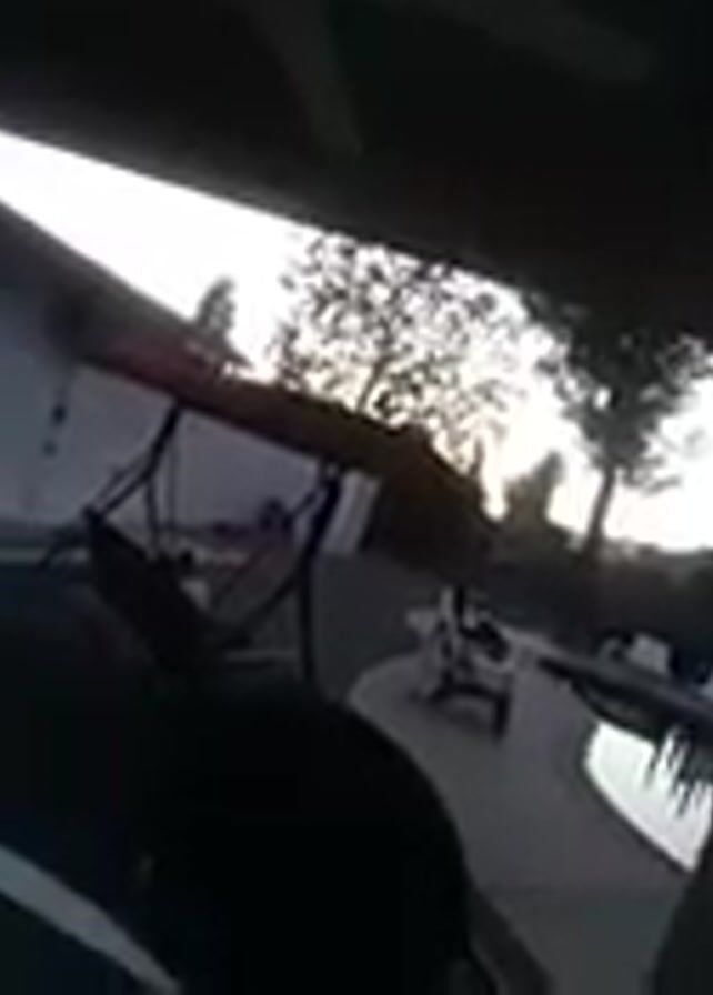 The video, shot from a low, slightly obstructed perspective, shows an outdoor scene with a swimming pool. A white shed or small building is visible in the background, along with trees silhouetted against the sky. Some pool furniture, including chairs and what appears to be a swing, are arranged around the pool. There's a dark foreground object, likely a vehicle interior. The sky suggests it's either early morning or late afternoon.
