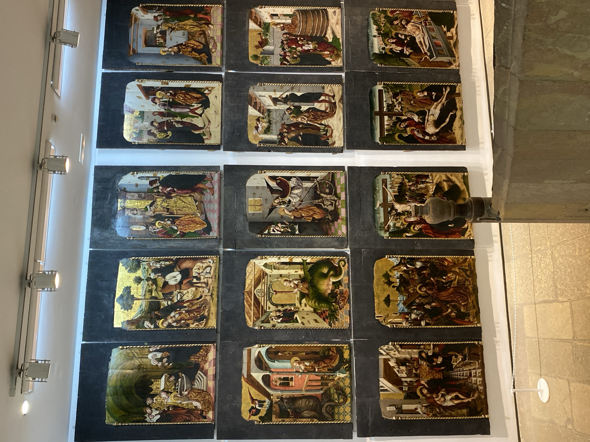 The image displays an interior view of a museum gallery, likely within the Museo de Bellas Artes de Asturias in Oviedo/Uviéu, Spain. Fifteen vertically oriented, rectangular devotional paintings are mounted on a plain white wall, arranged in a grid of three rows and five columns. Each painting is individually bordered by a dark, possibly black, surround and an inner gilded frame, featuring a slightly arched top edge. The paintings, executed in a late medieval or early Renaissance style, depict a narrative cycle of Christian iconography. The upper and middle rows largely feature hagiographical scenes, including various interactions with figures and objects, such as a baptism, a procession with a horse, a courtly gathering, scenes of judicial proceedings or arrest, and multiple instances of a female saint (distinguished by a halo) engaging with or encountering dragon-like creatures, as well as a martyrdom scene involving a figure on a barrel. The bottom row consistently illustrates the Passion of Christ, showing Christ before Pilate, carrying the cross, the crucifixion, the deposition from the cross, and the entombment. The gallery space is illuminated by a series of track lights mounted on the ceiling. The floor is covered with light-toned stone or ceramic tiles. In the lower foreground, a white stanchion with an attached white rope barrier is visible, delineating a viewing area. A dark, turned wooden newel post and a robust stone balustrade are present on the right side of the frame, indicating the presence of a staircase or an elevated architectural feature.