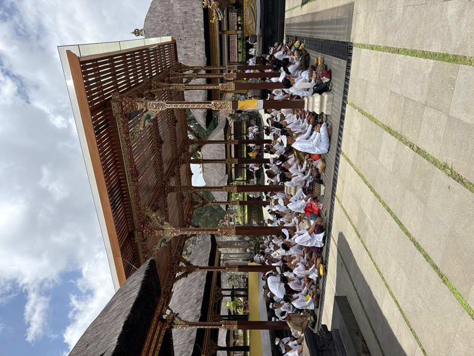 - "A group of people, mostly dressed in white, sit in rows under a covered pavilion with ornate wooden pillars and thatched roofs" by FM-RjPGA3, licensed under CC BY 4.0
