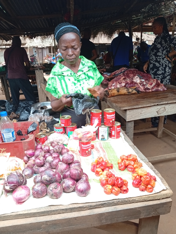 The image depicts an outdoor market scene in Omicha Umu Awada, Nigeria, beneath a structure featuring both corrugated metal and thatched roofing. In the immediate foreground, an adult woman with dark skin, wearing a green patterned short-sleeved top and a blue-and-black knitted head wrap, is positioned centrally. She is looking down intently, manipulating a small black plastic bag and a brown, irregularly shaped object with both hands. Before her, a rough wooden table is covered with a white cloth featuring green stripes. Arranged on this table are various items: to the left, a clear plastic bottle containing a clear liquid, partially obscured black plastic bags, and a red plastic crate fragment. Centrally, a large mound of approximately 40-50 red onions is displayed. To the right of the onions, several small piles of red and orange bell peppers or habanero-type peppers are present. Behind these vegetables, multiple red cans, some clearly labeled "TomatoGo Tomato Paste," are visible. In the middle ground, to the right of the primary subject, a substantial quantity of raw red meat, appearing to be beef or goat, is piled high on a separate wooden table, suggesting a butcher's stall. An adult woman with dark skin, dressed in a black-and-white patterned dress, stands to the right of this meat stall, observing the contents with her right hand on her hip. To the far left, partially obscured and facing away, an adult man in a maroon shirt is visible, engaged in activity at an adjacent stall. Further into the background, additional market stalls with similar roofing materials and blurred figures indicate continued market activity. The ground appears to be earth.
