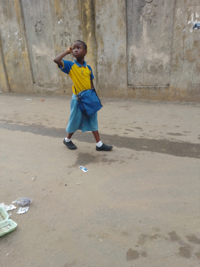 A young girl in a yellow and blue uniform walks on a road. She has a blue bag slung over her shoulder and white socks. Her left hand is raised to her forehead. The road is asphalt with litter scattered on it. Behind her is a large, textured concrete wall with visible seams and some decorative elements. The scene appears to be an urban or semi-urban environment.