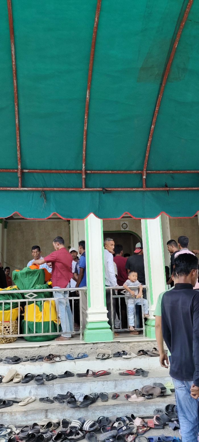 The image depicts an outdoor or semi-enclosed gathering in Cut, Indonesia, under ambient daylight. An overhead teal-green fabric canopy, supported by a framework of reddish-brown metal poles, covers the area. The canopy's lower edge is scalloped with a red trim. Below the canopy, white architectural pillars with green bases and vertical green stripe accents frame an open space. An arched entrance is visible in the background, with a circular emblem featuring dark text or symbols affixed to the wall above it. In the center-left, a prominent rectangular object, possibly a tomb or ceremonial structure, is draped in green and yellow fabric, exhibiting an ornate golden-patterned base on its lower left side. An adult male, barefoot, wearing a red long-sleeved shirt and blue jeans, is leaning over this draped object, appearing to adjust or place an orange fabric item on it. Another barefoot adult male in a light blue patterned shirt stands to his left, observing. Approximately fifteen to twenty individuals, predominantly adult males, are present. They are dressed in casual attire, including t-shirts and long pants; several are barefoot. To the right, a young boy in a light-colored t-shirt and patterned pants stands on the bottom rung of a silver-colored metal railing, looking towards the left. Other men are distributed throughout the scene, standing and observing the central activity. In the foreground and lower section of the image, concrete steps descend from the main gathering area. These steps are covered with a collection of approximately 50 to 70 pairs of various sandals and shoes, indicating that individuals have removed their footwear before entering the elevated space. The back of a person in a dark shirt and blue jeans is partially visible in the lower right foreground, standing on these steps.