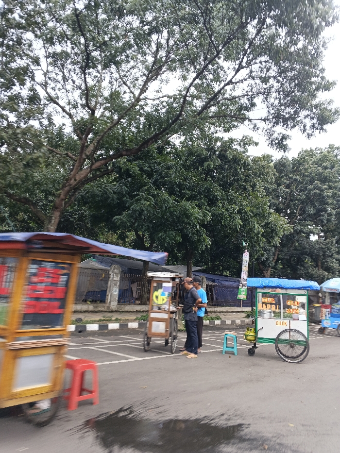A street scene features food vendors with mobile carts. Two men stand near a cart displaying "CILOK" signage. Additional carts are visible, one appearing in motion on the left and another further down the street. The scene is set against a backdrop of lush trees and gray skies. The road surface shows signs of dampness, and a parking area is marked with white lines.
