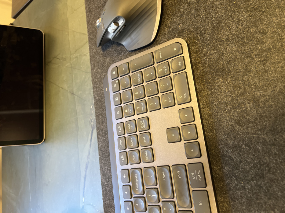 The image displays a static workstation setup located in Kafr Yasif, Israel. In the foreground and midground, a dark gray felt desk mat covers the surface. Positioned on the felt mat is a silver-toned Logitech wireless keyboard with dark gray keys, which includes a full numeric keypad. To the immediate right of the keyboard, also on the felt mat, lies a gray Logitech wireless mouse, characterized by an ergonomic shape, a primary scroll wheel, and a secondary side-mounted thumbwheel. In the background, resting on a light green/blue marbled desk surface, a tablet device with a dark, reflective screen is oriented horizontally; a portion of its light-colored frame is visible. No individuals are present, and no active interactions are depicted within the scene.
