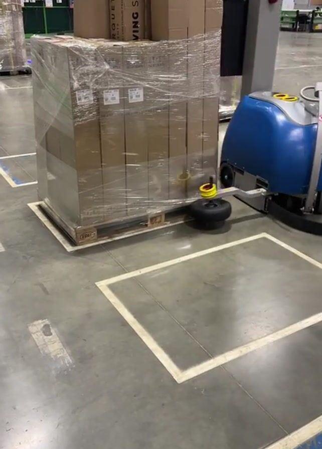 n automatic pallet wrapping machine in operation in a large warehouse. The machine is blue and gray, with a circular wrapping arm. A large pallet of boxes, wrapped in clear plastic, sits on the floor. The machine is moving around the pallet, wrapping it in more plastic. The floor is gray concrete with white square outlines painted on it. In the background, there are more wrapped pallets and boxes, as well as a person standing near some shelving. The lighting in the warehouse is bright.