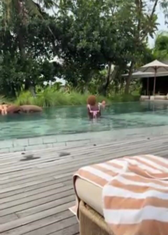 The video captures a scene at a swimming pool, with a woman standing in the water and a man swimming nearby. The woman has dark skin and short, curly, reddish-blonde hair. She is wearing a light pink bikini with a polka dot pattern. The man has a light skin tone and short dark hair, and his face is visible as he swims. The pool is surrounded by a wooden deck, with a lounge chair visible in the foreground. The chair is topped with a beige cushion and has a folded towel with beige and white stripes. Behind the pool, there are trees, plants, and a small structure with a thatched roof. The overall setting suggests a tropical or resort-like environment.