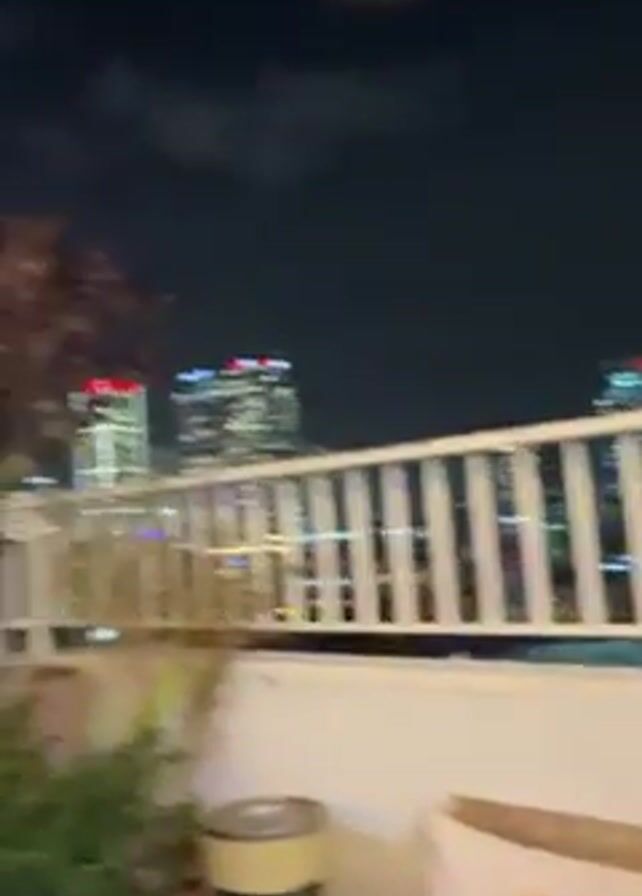 nighttime view from a rooftop terrace in a city