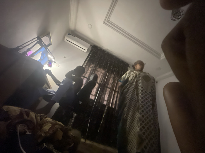 The interior shot, taken at a low angle, features a person in the foreground, obscuring part of the view. A woman in a long patterned dress stands further back. To the left, a person sits at a desk with a computer and a bright light. Curtains partially cover a window behind the woman. An air conditioning unit is mounted high on the wall near the ceiling. The room's ceiling is white with ornate molding.