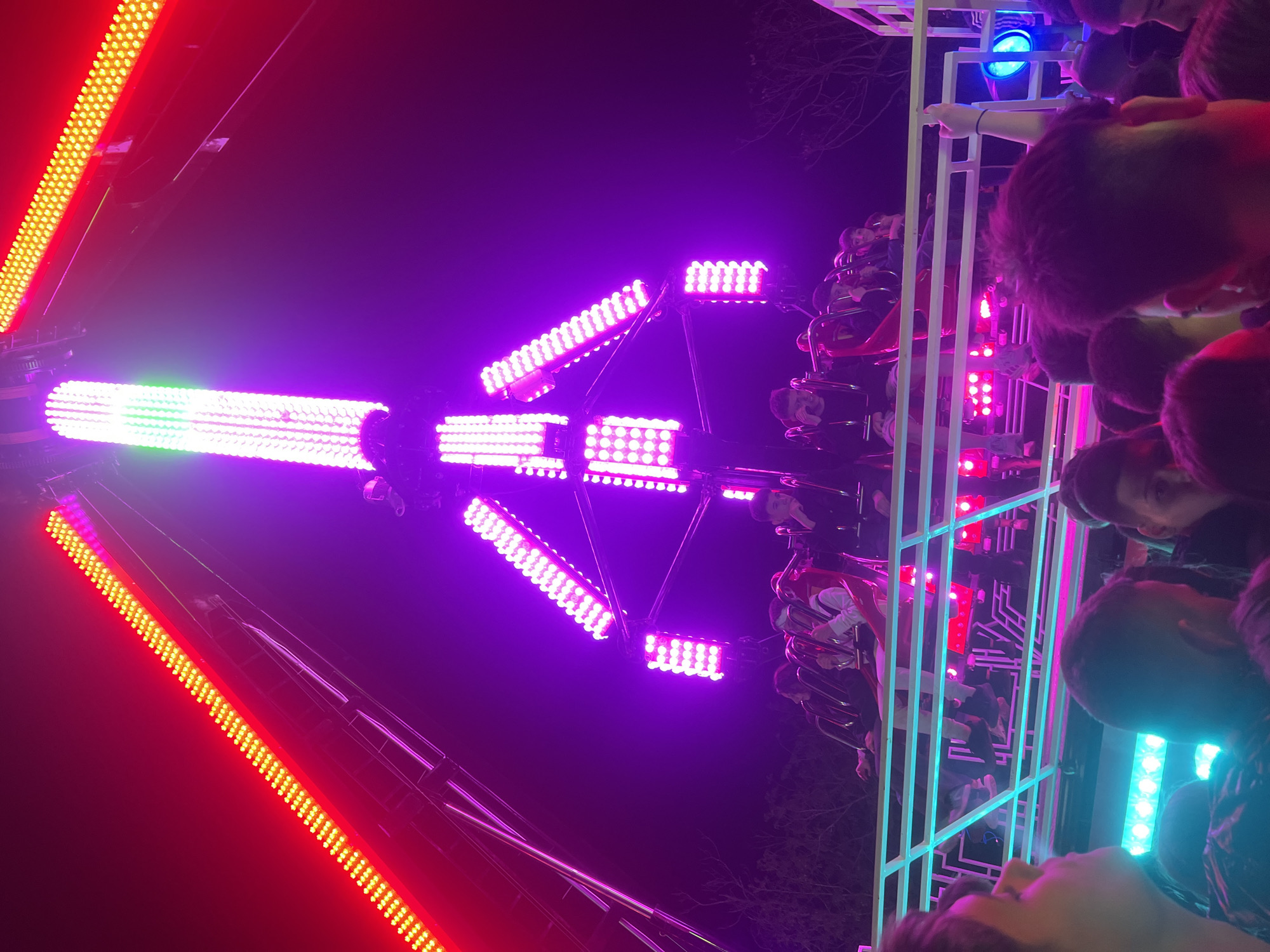 brightly lit fairground ride at night