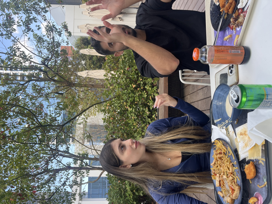 The image displays two individuals seated at a white outdoor table, situated in the city of Bnei Brak, Israel. The scene is illuminated by daylight. On the left, a female subject with long, light-brown hair wears a dark blue full-zip athletic top over a black garment. A silver pendant necklace is visible. Her head is turned to her right, and her right hand is slightly raised, palm open, as if mid-gesture. On the right, a male subject with dark hair and a beard, wearing a black short-sleeved t-shirt, is depicted with both hands raised upwards, palms open and fingers spread, partially obscuring his face as he gazes towards his hands. The table surface shows a black serving tray containing remnants of a meal, including noodles with chicken and vegetables, a piece of fried food, and a fork. Also present are a blue ceramic bowl with a light-colored liquid, an empty green soda can with Hebrew text, a clear glass bottle with an orange cap containing an orange liquid, and a silver-colored smartphone. Scattered used white paper napkins and food debris are also visible on the table. A white metal chair back is partially visible on the right. The background features green trees and shrubs. Beyond the vegetation, modern multi-story buildings with reflective glass facades are present under a partly cloudy blue sky. Several large, folded beige outdoor umbrellas are also visible in the mid-ground. The ground beneath the table appears to be a wooden deck.