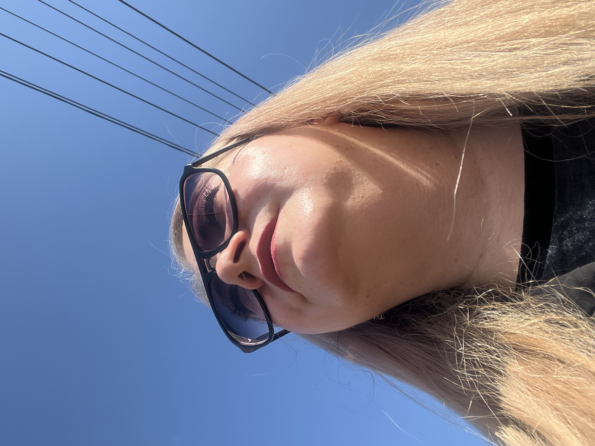 - "A woman with blonde hair and sunglasses is depicted from a low angle against a bright blue sky" by FM-MtN7u1, licensed under CC BY 4.0