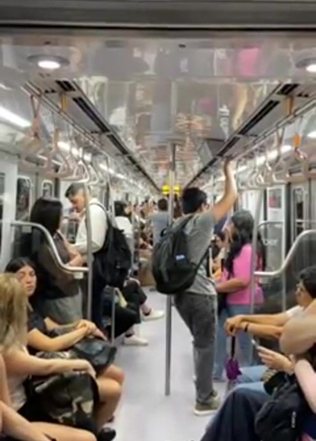 Inside a subway car, about 20 or more people are visible in various poses, seated or standing, filling the space. Some passengers are holding onto the overhead handrails. The car appears to be in transit, as slight movements are noticeable. The interior is well-lit by ceiling lights. The walls and ceiling are primarily metallic, with advertisements and transit information visible on the walls. The passengers are diverse in age and attire, with casual clothing being the norm. Backpacks and bags are common accessories. The atmosphere suggests a typical commute.