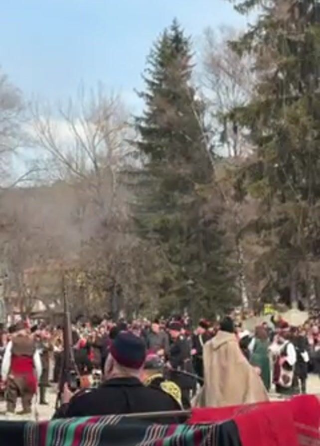 gathering of people in a park or public square. The people are dressed in a variety of traditional costumes, some of which appear military. There is a group of men firing rifles into the air, creating smoke. In the foreground, there is a table covered with a striped, colorful blanket. The environment includes trees, some bare and some evergreen, under a bright blue sky. The video captures an event or performance with a cultural or historical theme.