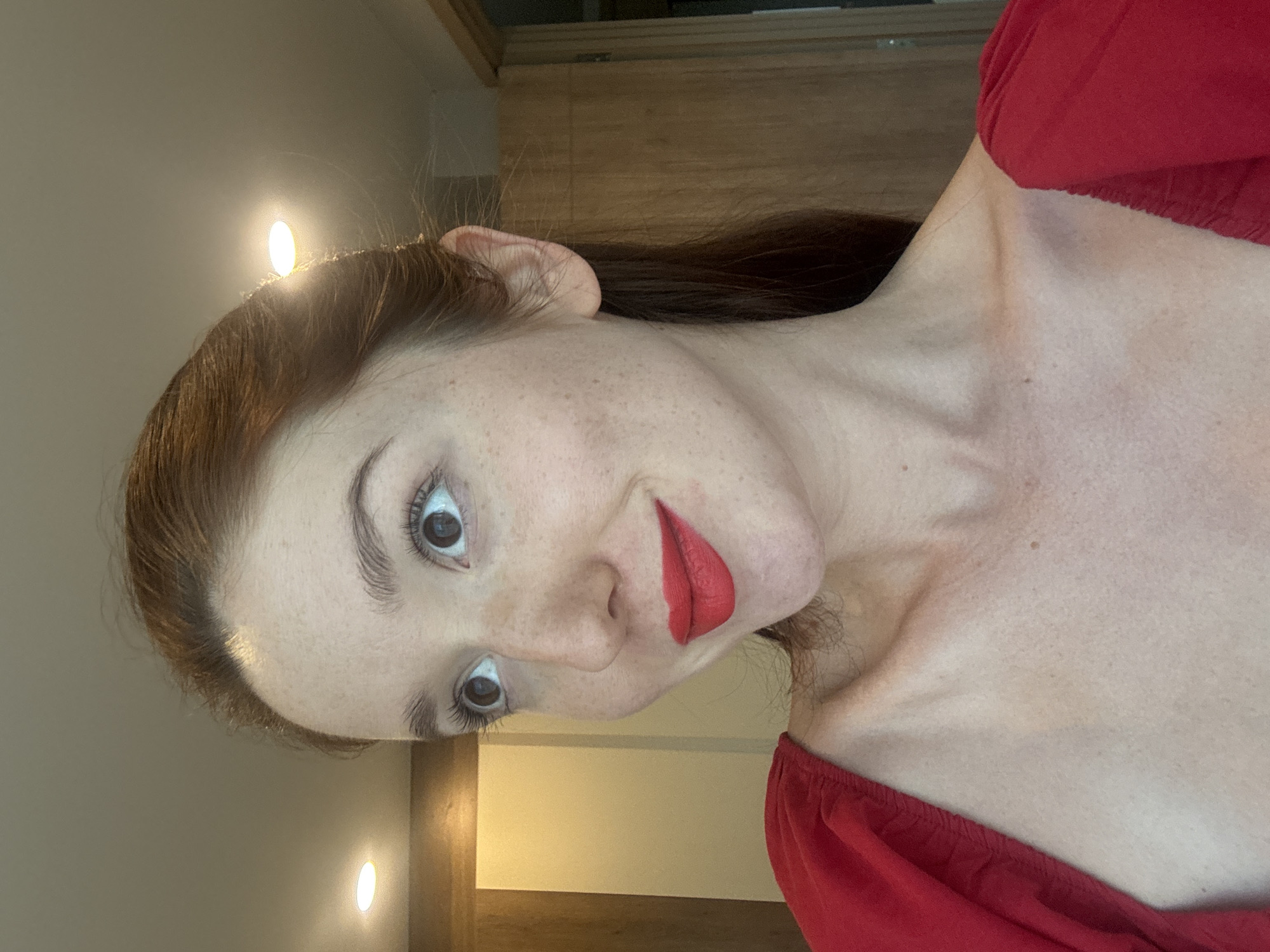 A woman is angled in a selfie. The woman has fair skin, brown hair, and red lipstick. She is wearing a red shirt. The background includes a light-colored wall and a wooden cabinet. The location in the city of Choeng Thale, Thailand is not evident in the image.
